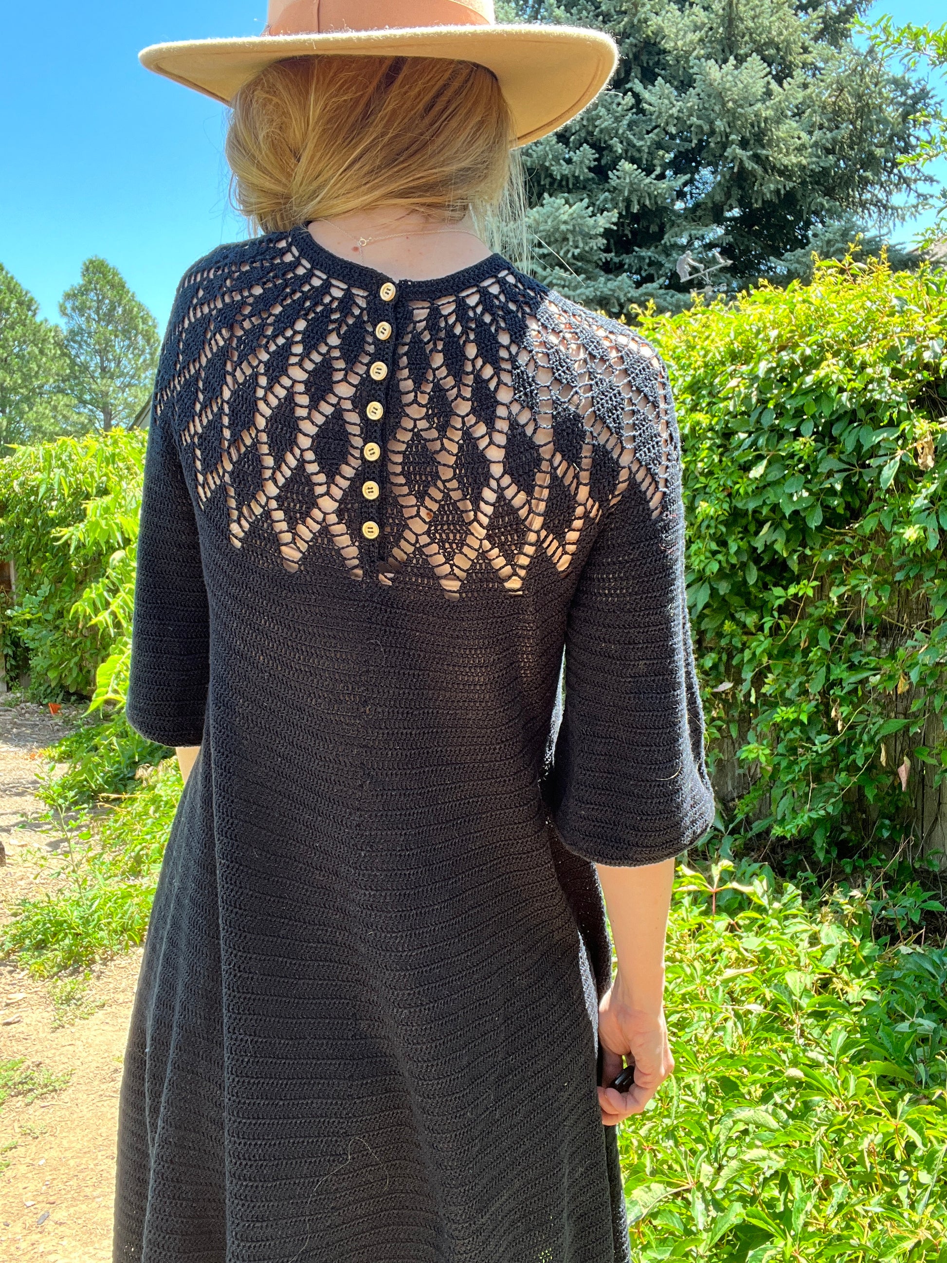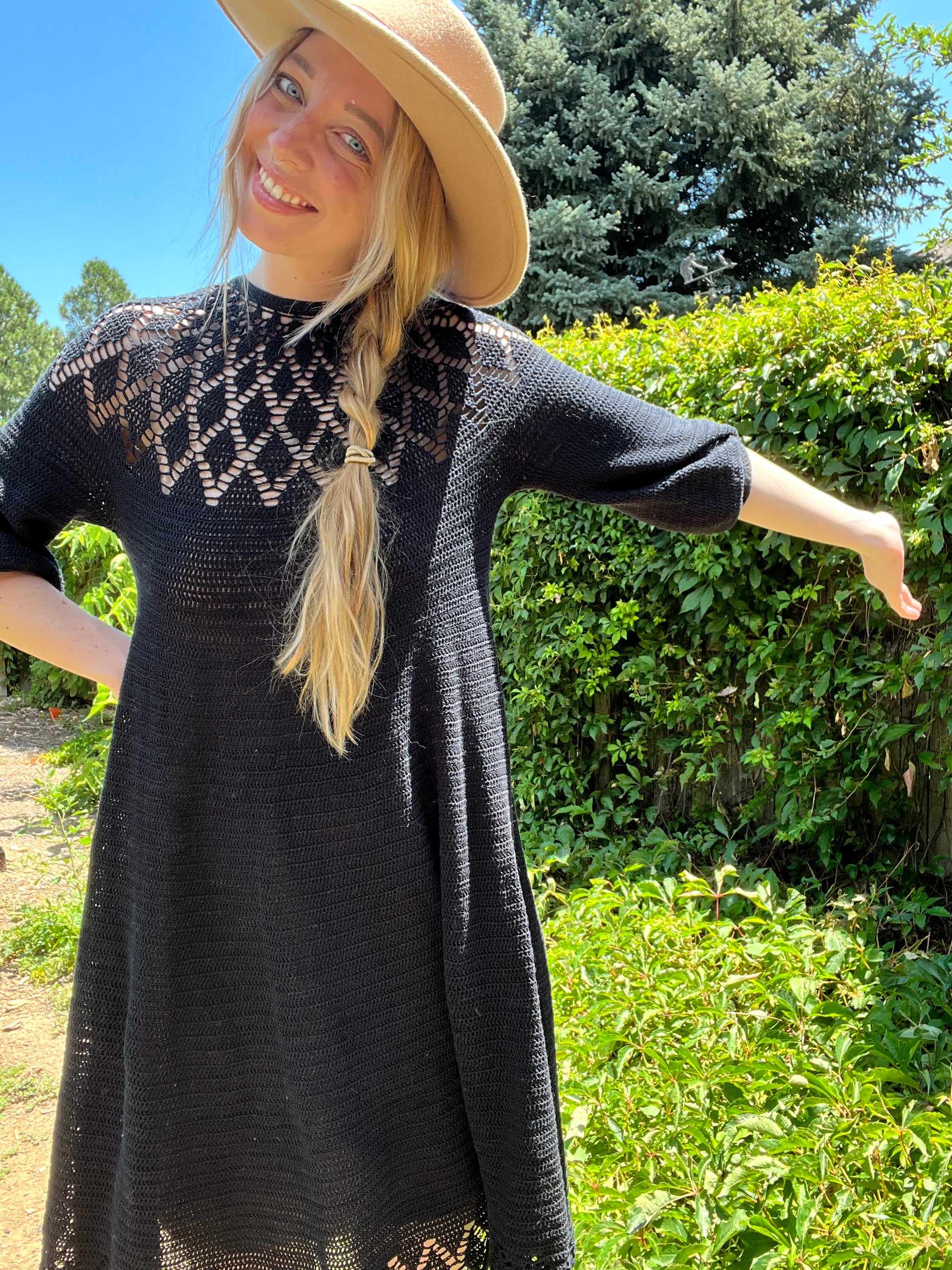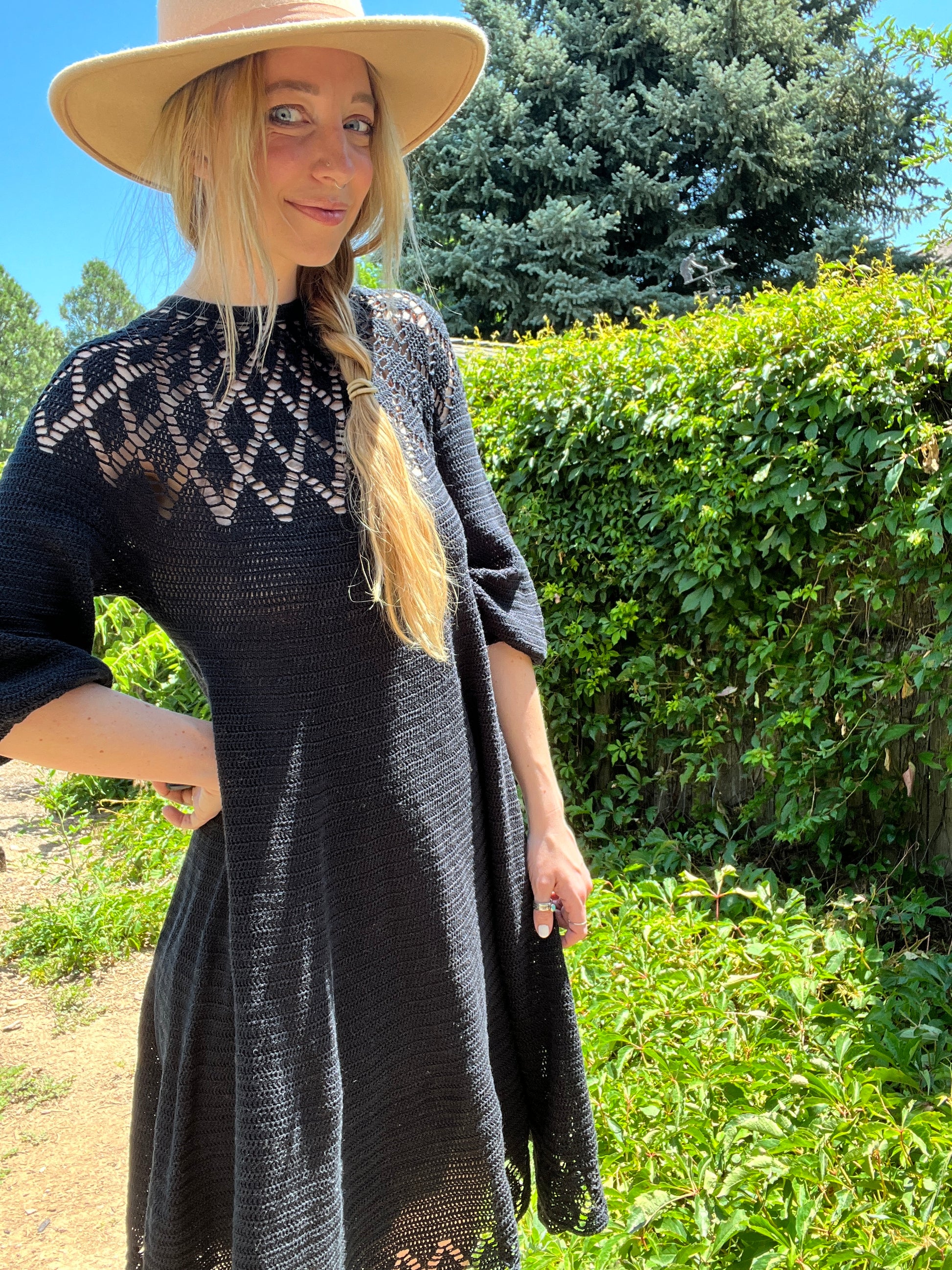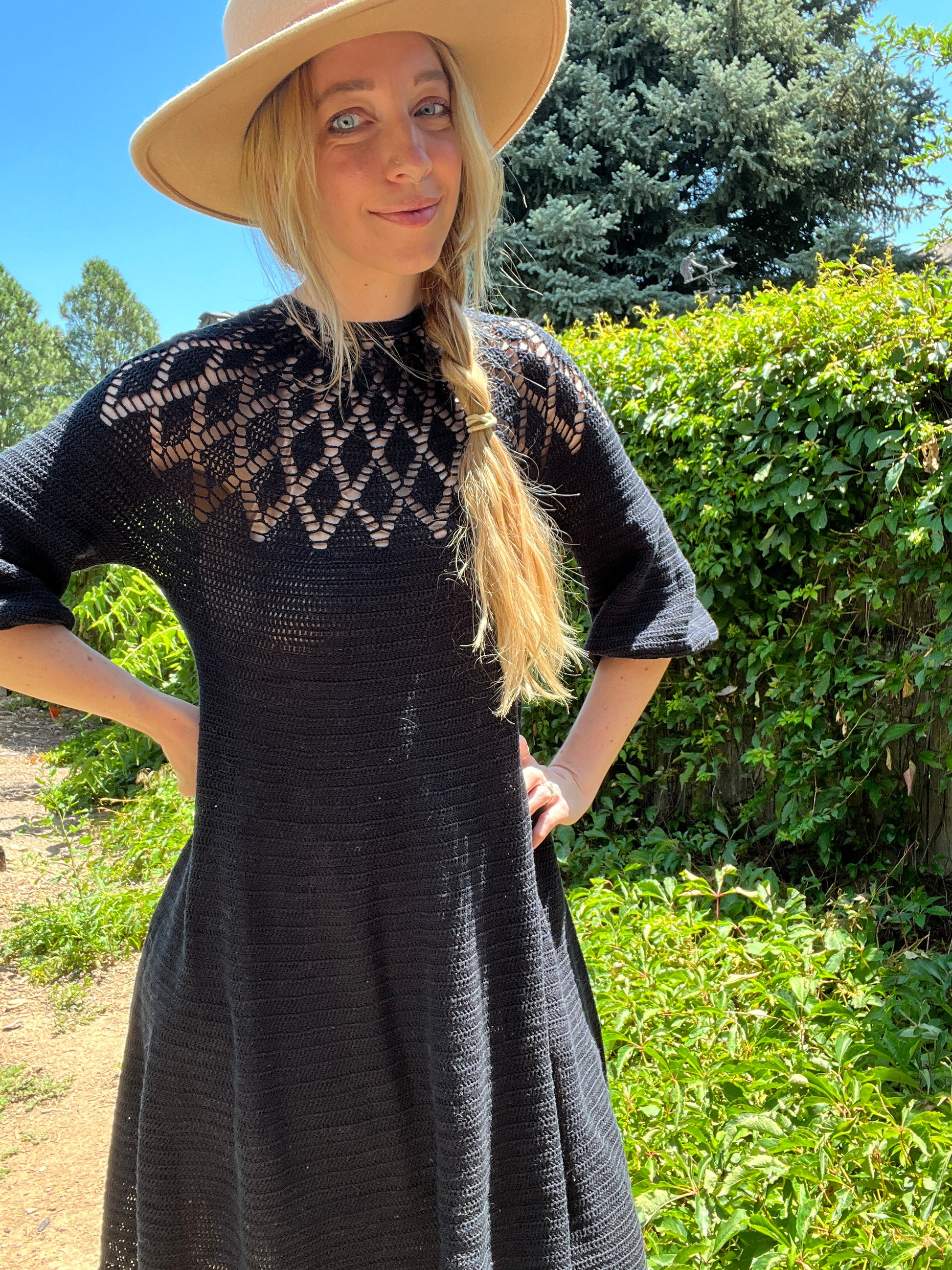 This stunning project is worked from the top down with a circular yoke that gradually increases in its cascading diamond lace pattern until separated for body and sleeves. Once you’ve separated for body and sleeves, follow the directions to make either the top or the dress. Conveniently, you can continue working both the top and the dress until it reaches your desired length.