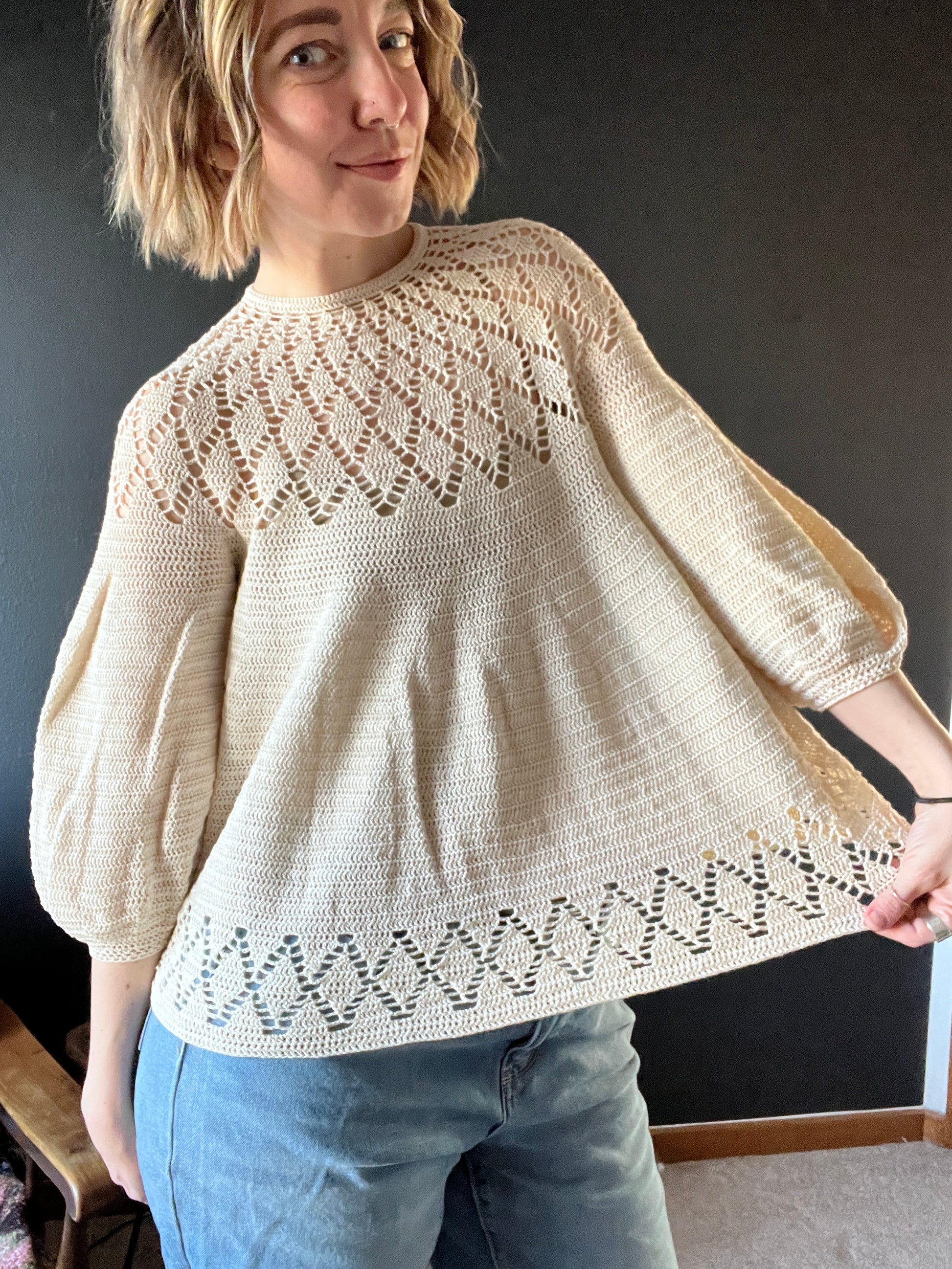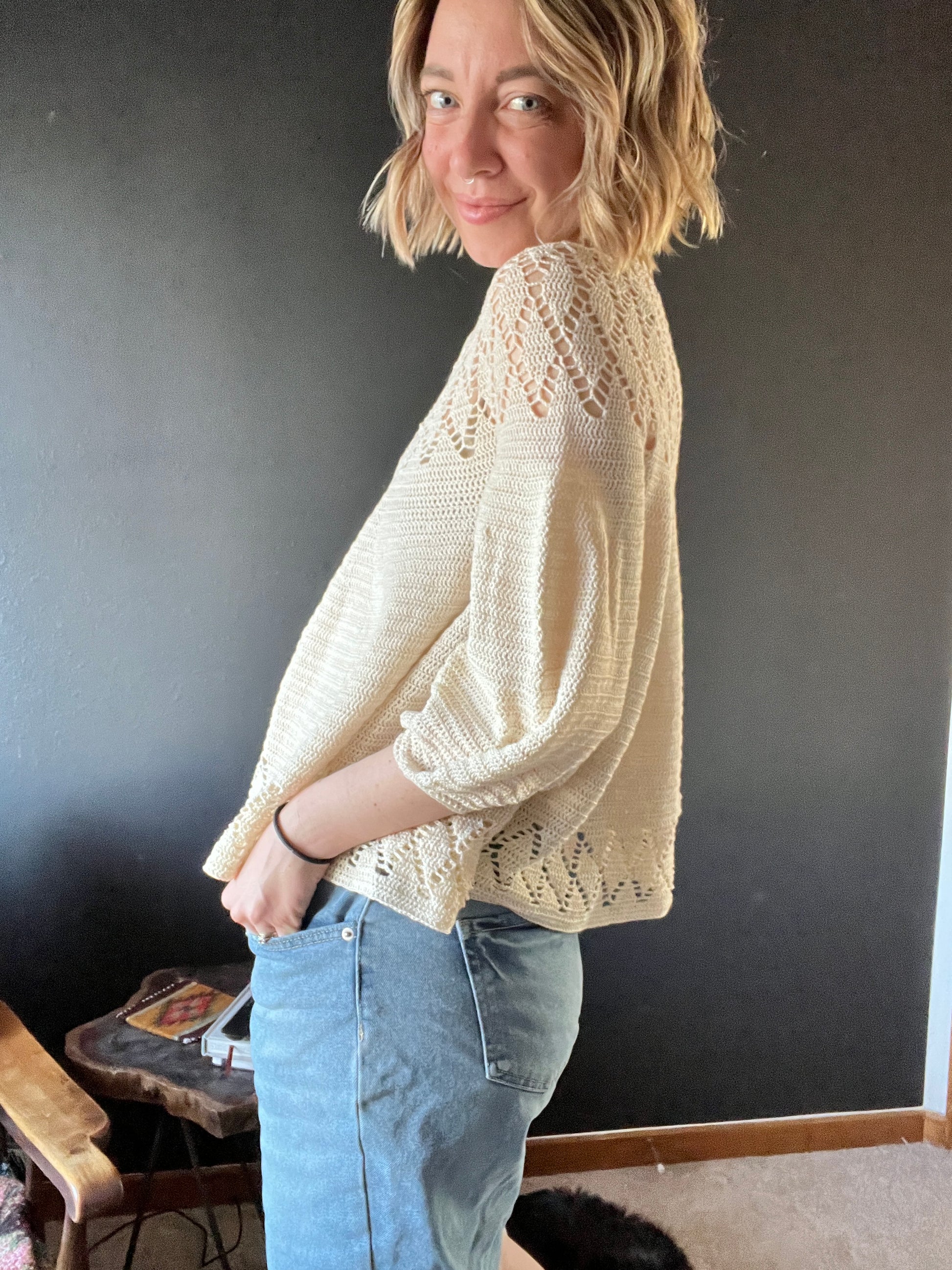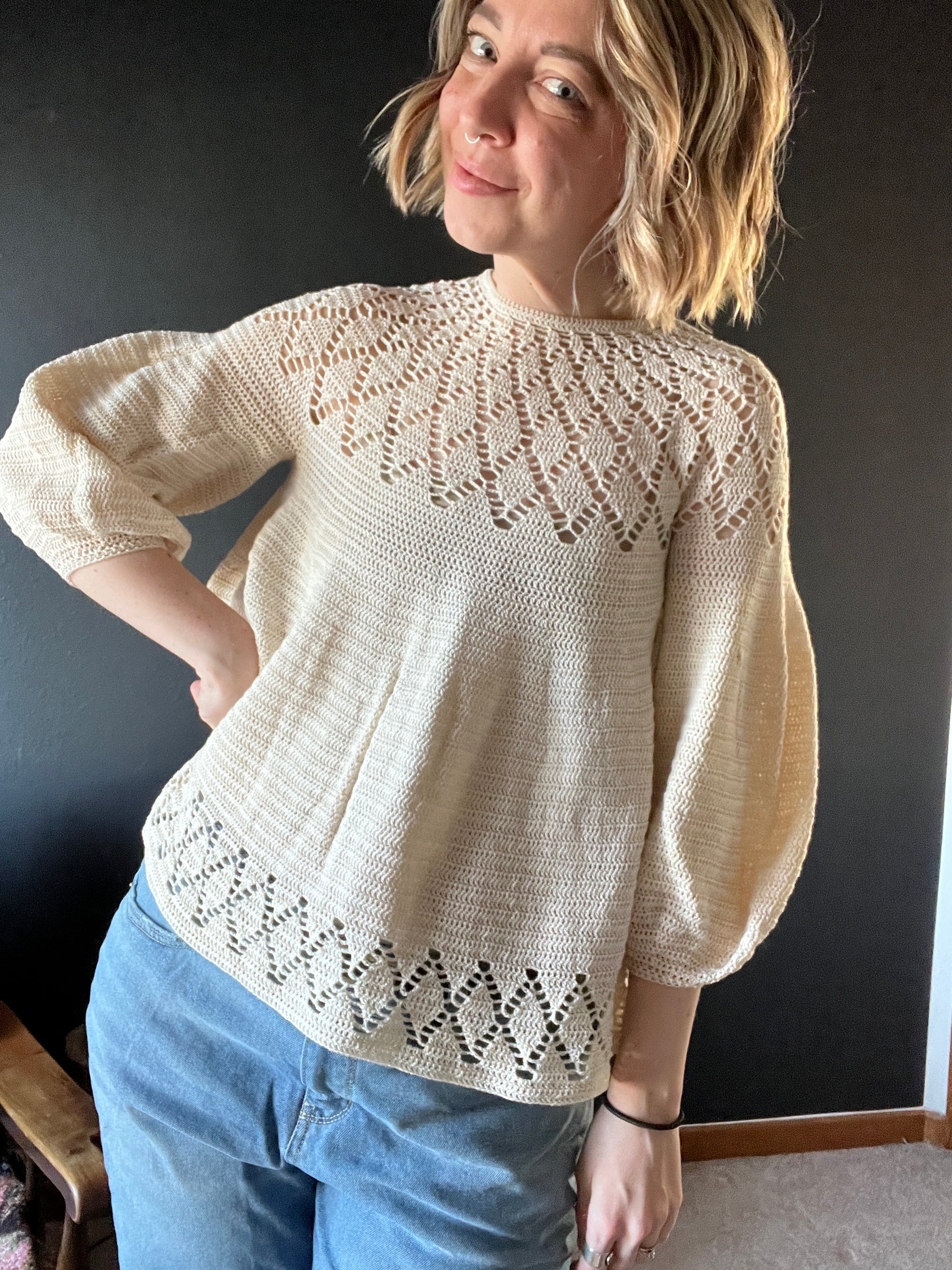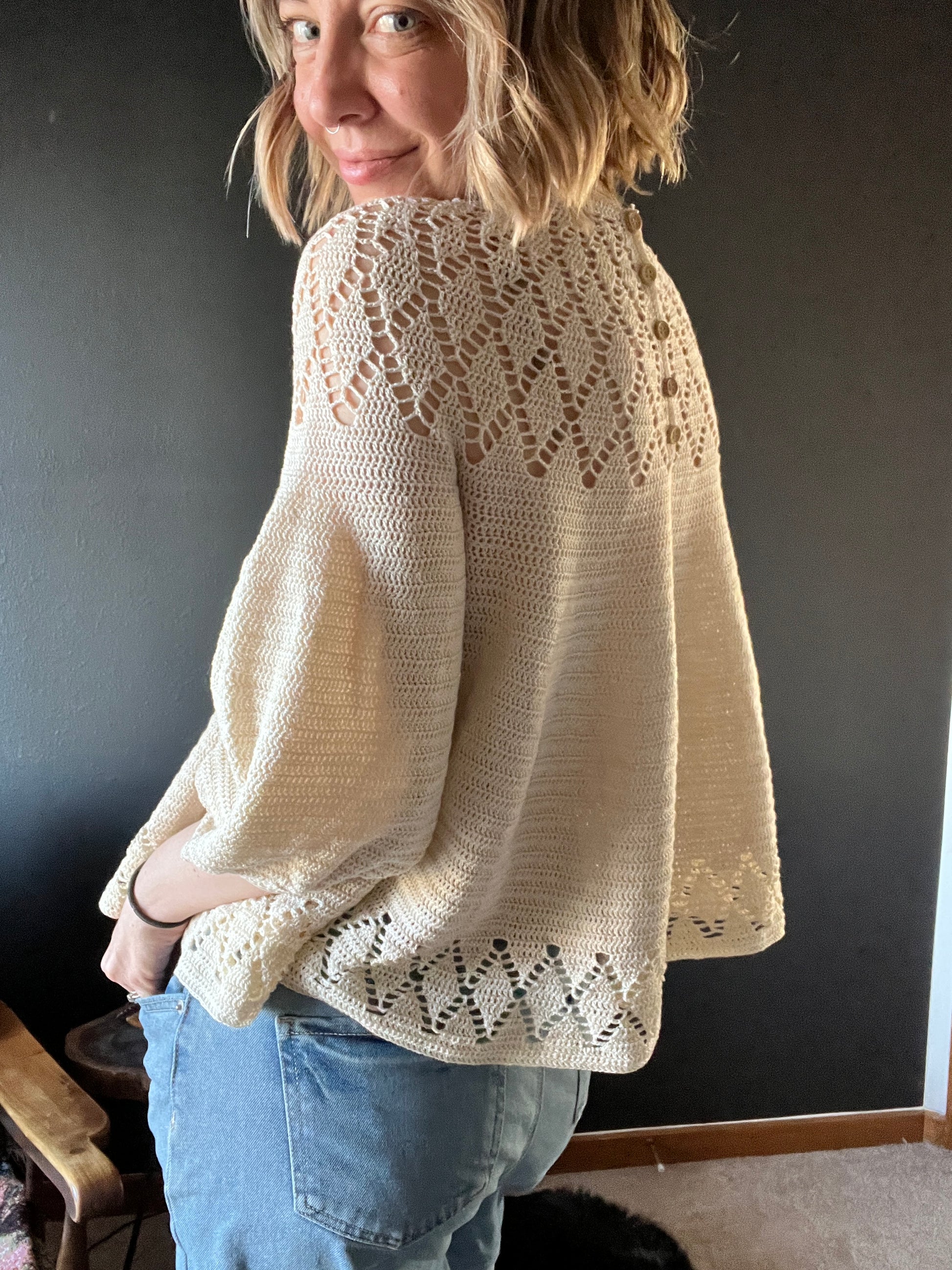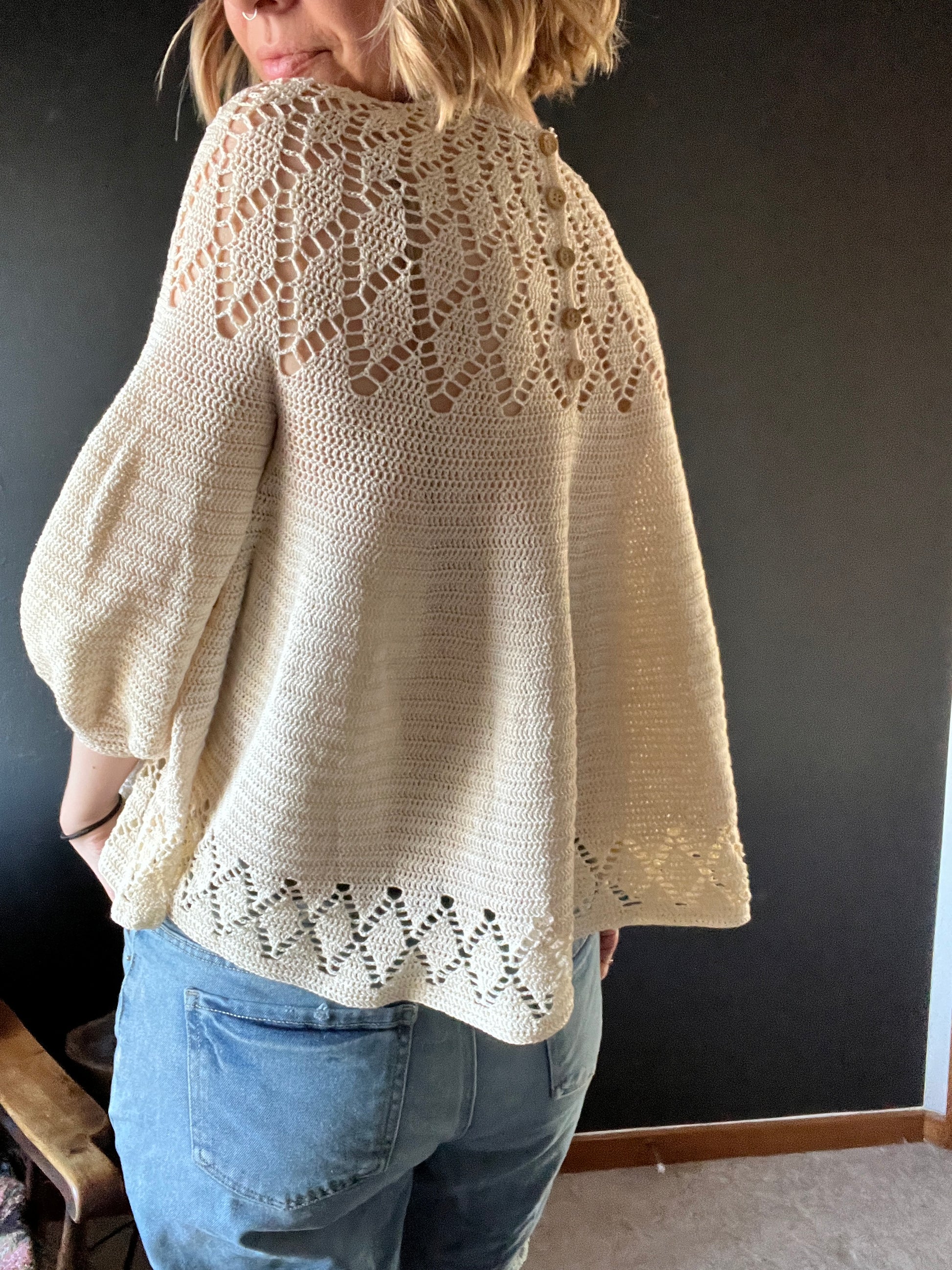 This project is light and breezy for hot temperatures and incredibly fashionable. Wear it with the buttons in the back for a delicate high neck or with buttons in front done or undone, depending on your desired look.