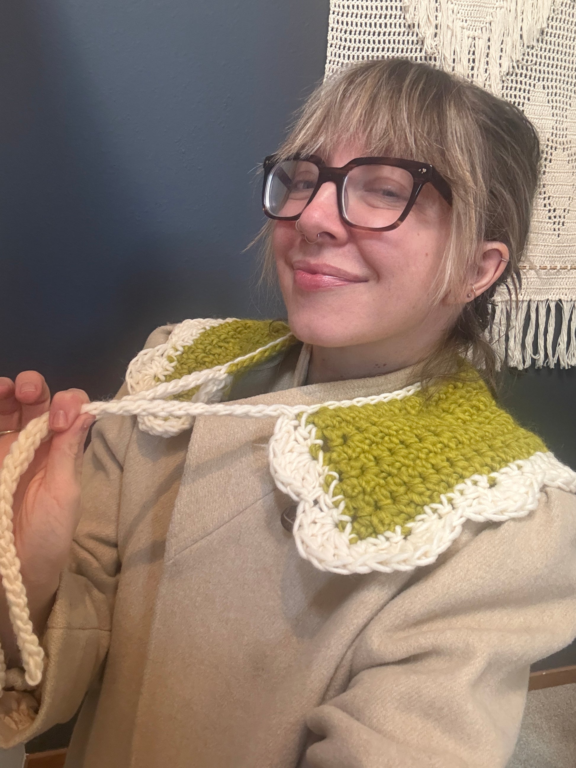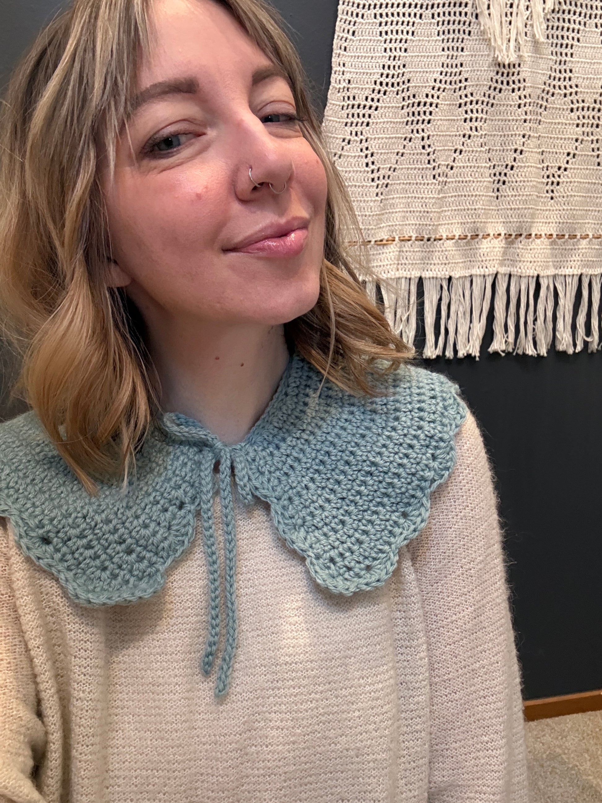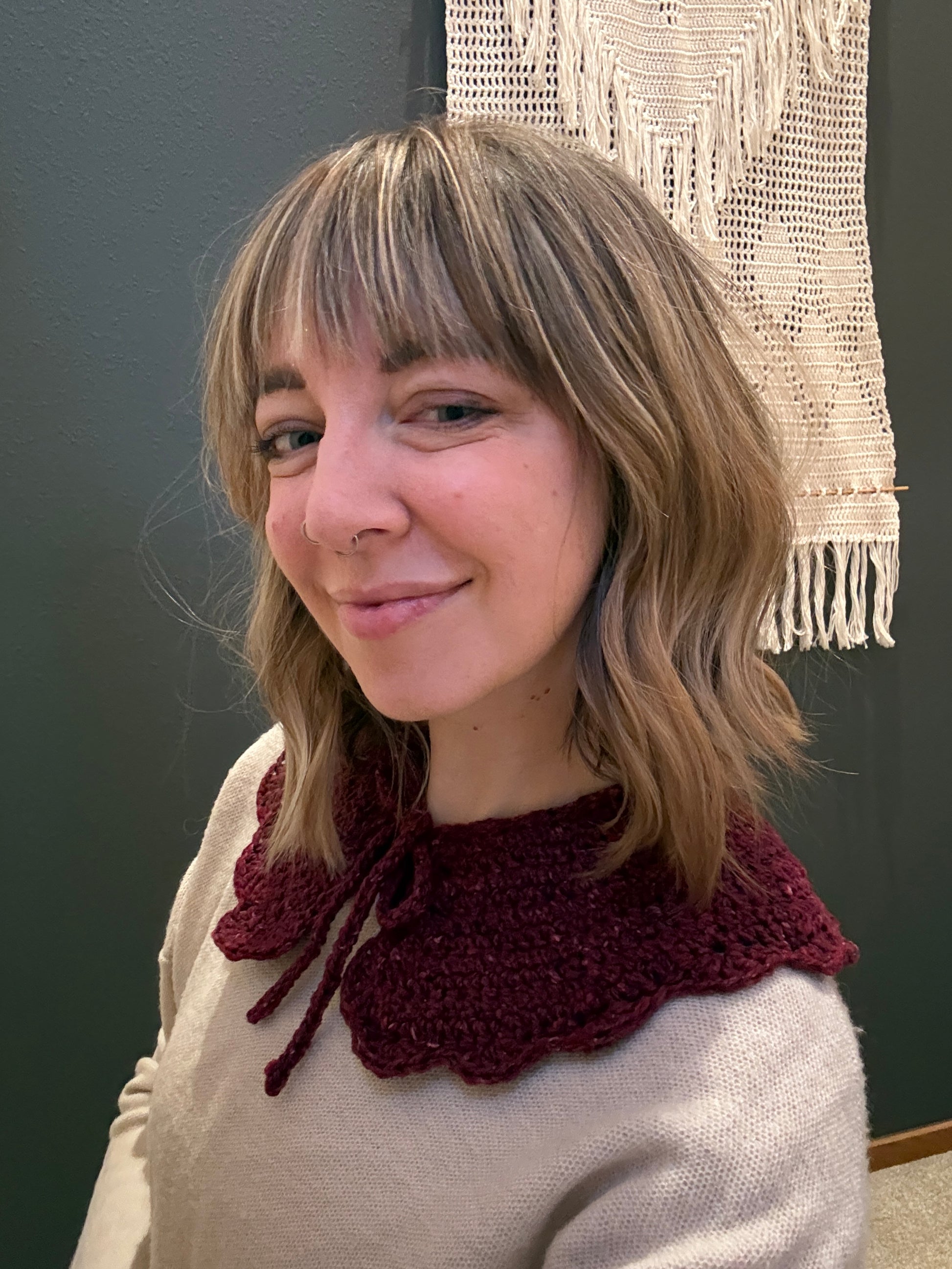 This Too Cute Collar pattern is designed and written in such a way that you can use any scrap yarn ranging from DK-weight through bulky. The size is also variable depending on your preference. This is the perfect pattern for using up that half-skein of unused yarn and making a fun accessory. Make this in the same yarn as your favorite sweater so you can wear them together to add an extra fun look to your crochet projects!